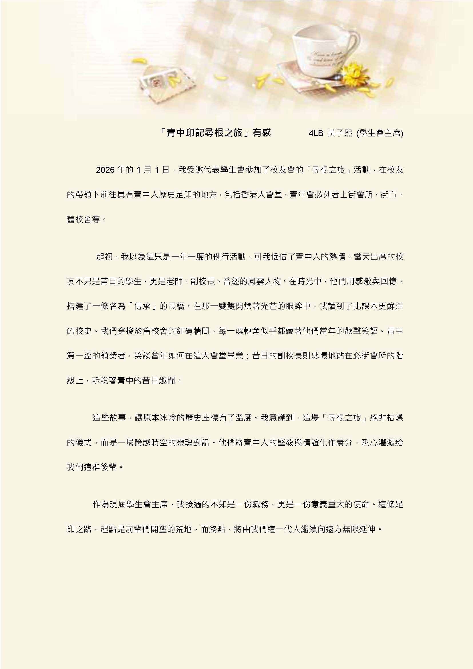 Academic Year 2025 - 2026 Date 2026-01-01 2026年元旦日,「青中印記尋根之旅」圓滿舉行。當天,一眾學長、校友積極參與,由謙社(71謙)學長梁勝棋校長悉心導覽,依次走訪中環大會堂、士丹頓街、永利街、青年會、必列啫士街舊校址等承載著學校歷史印記的地標。 本校校友會負責老師 ---- 古啟貽老師、王頌軒老師帶領學生會代表5LC蘇靖淇、4LB文立行、4CL鄧沛光、5PT彭鳳儀、4LB黃子熙等同學,一同踏上這段充滿回憶的旅程。
