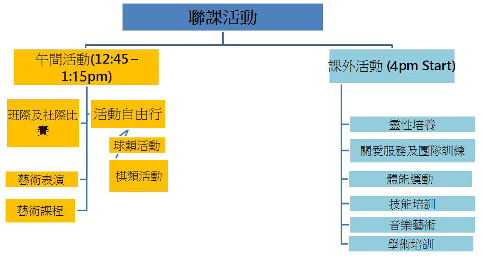 聯課活動分為午間活動、課後延伸活動及課外活動三部份。活動推行安排為: