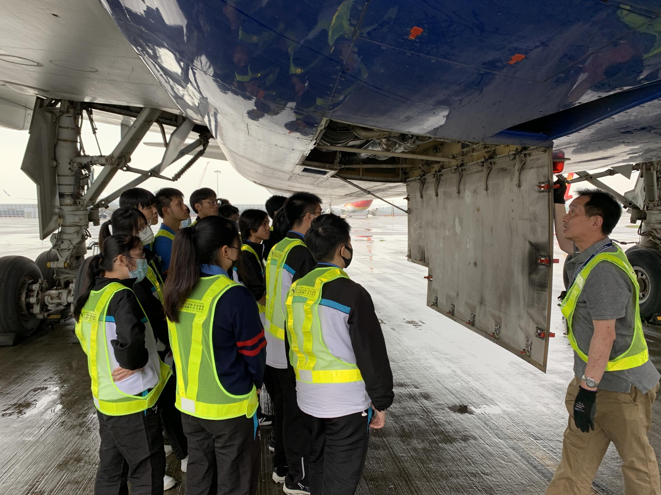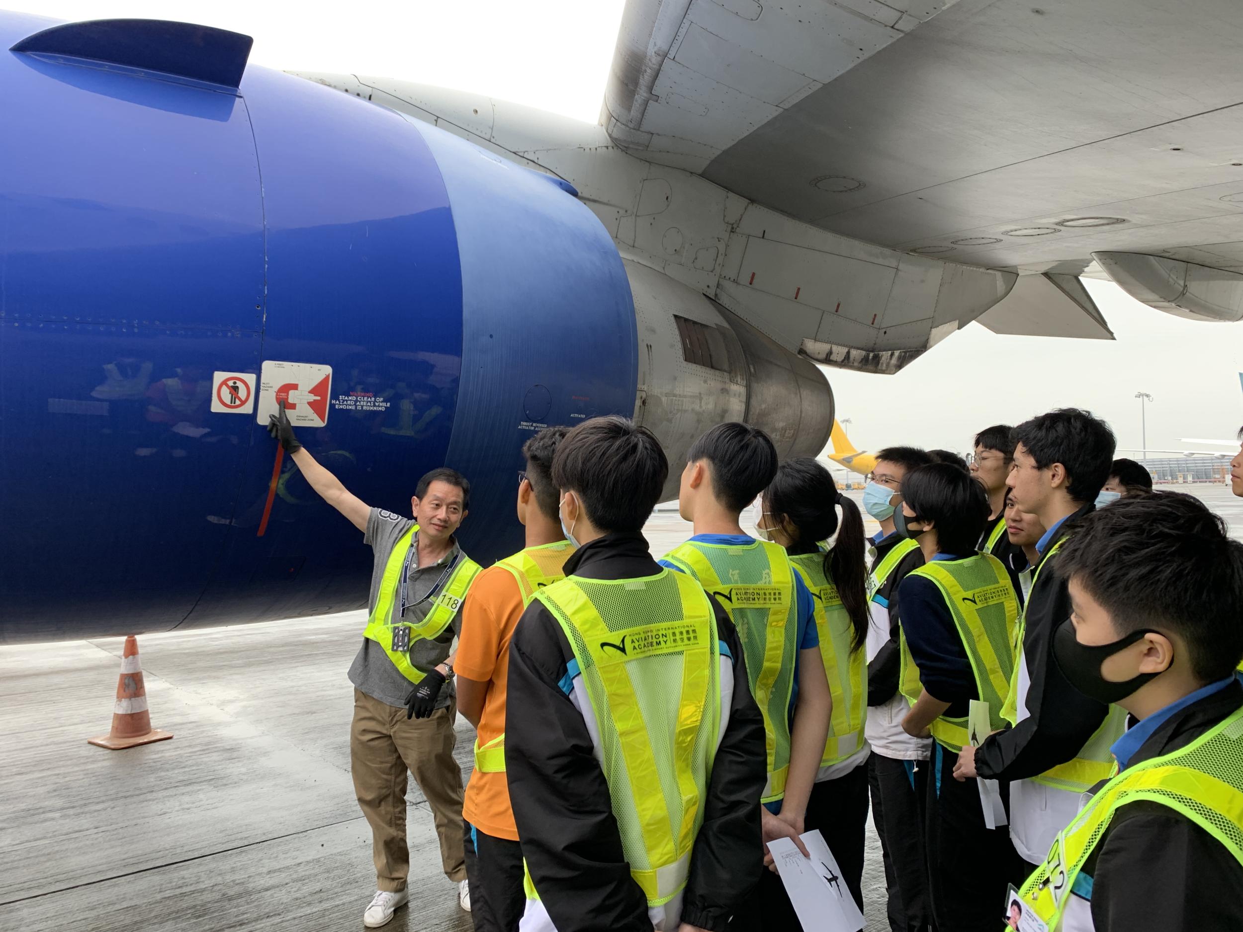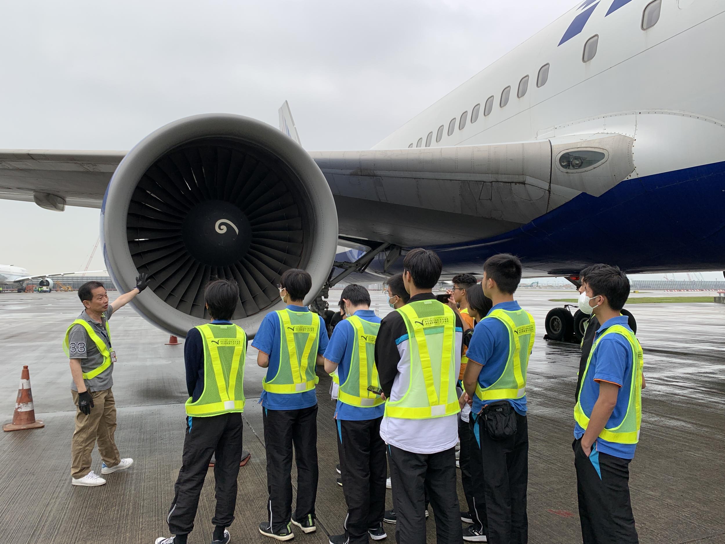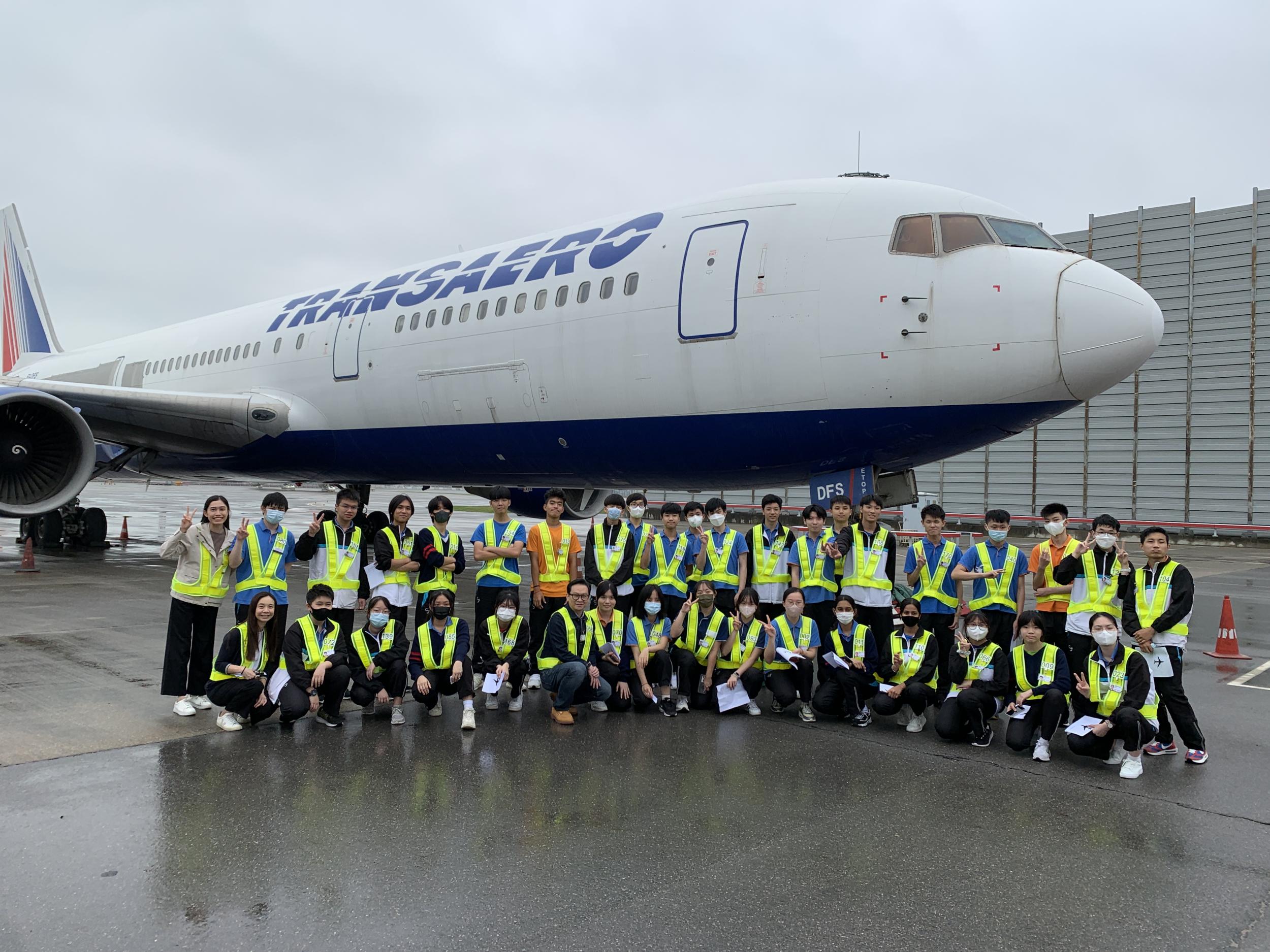 活動的重頭戲是,學生們被安排持特別通行證進入停機坪禁區,那裡停放著一架真正的767-300ER飛機。講師以小組形式向我們的學生解釋了飛機的設計,以及進一步的工作場所情況。這啟發並培養了他們對航空的興趣。