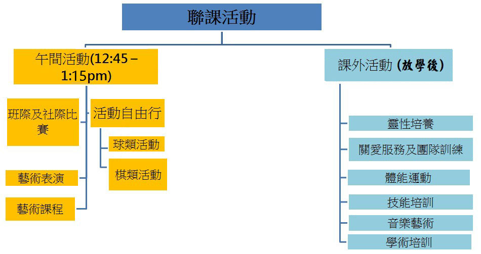 聯課活動分為午間活動、課後延伸活動及課外活動三部份。活動推行安排為: